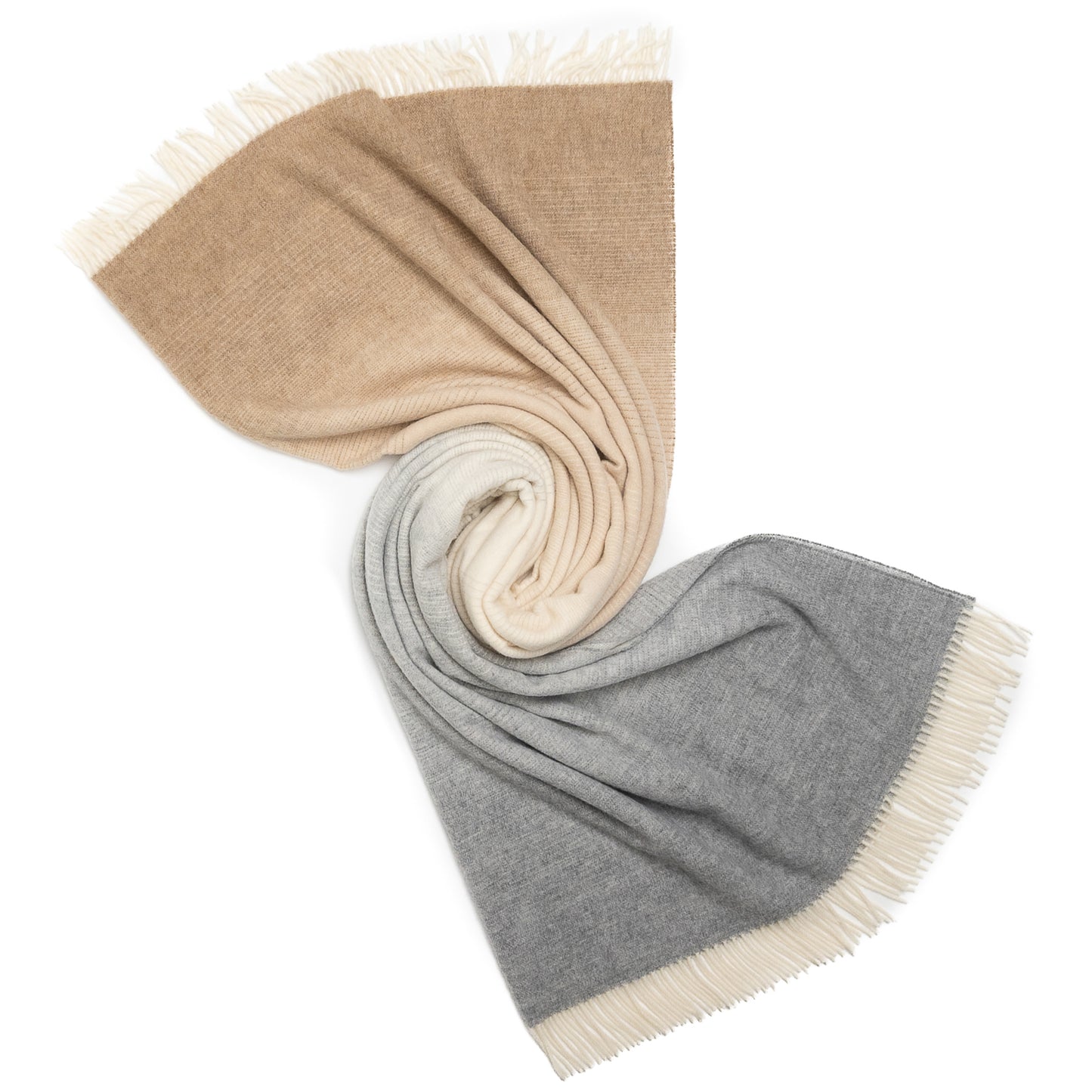 A quiet study in neutrals, this ombré throw moves from warm cream to cool grey. Woven in the UK from fine Merino wool, it layers any space with understated elegance.