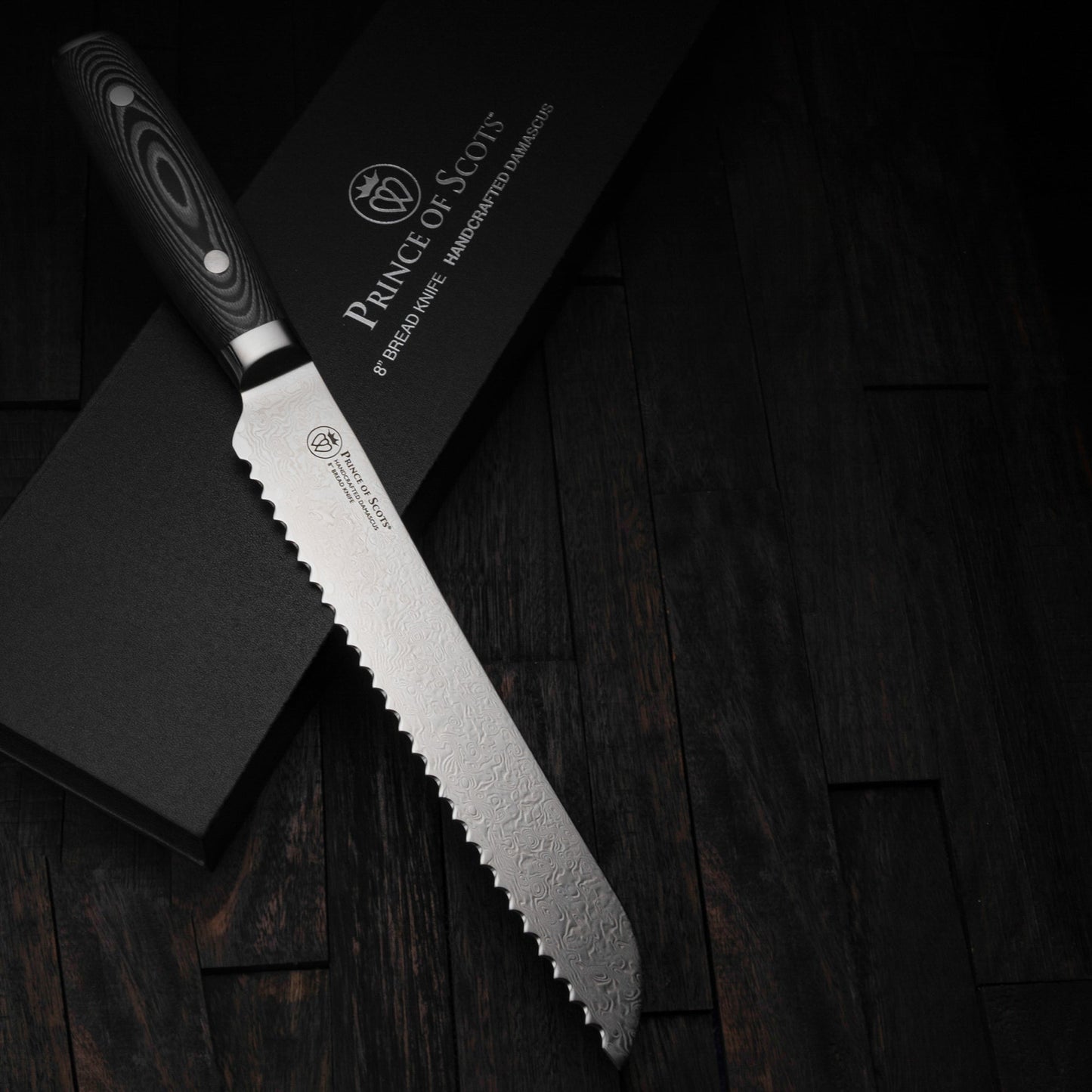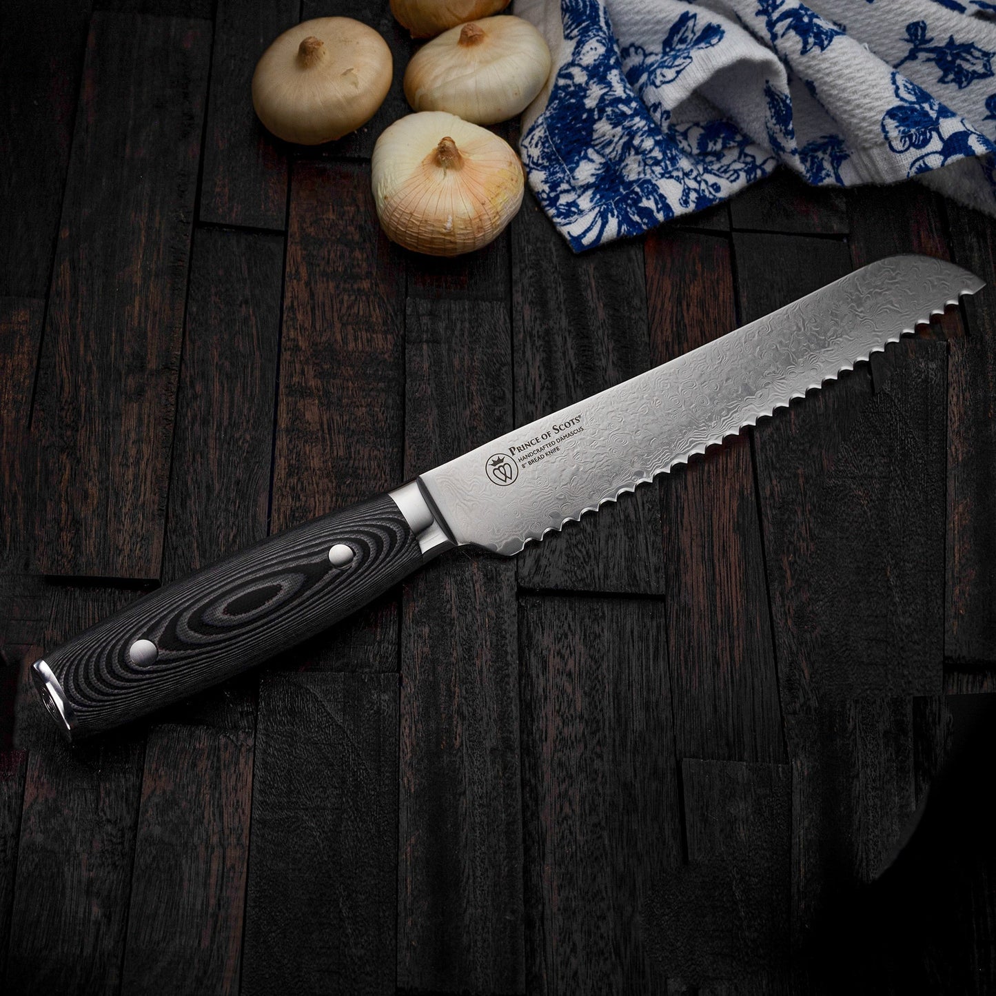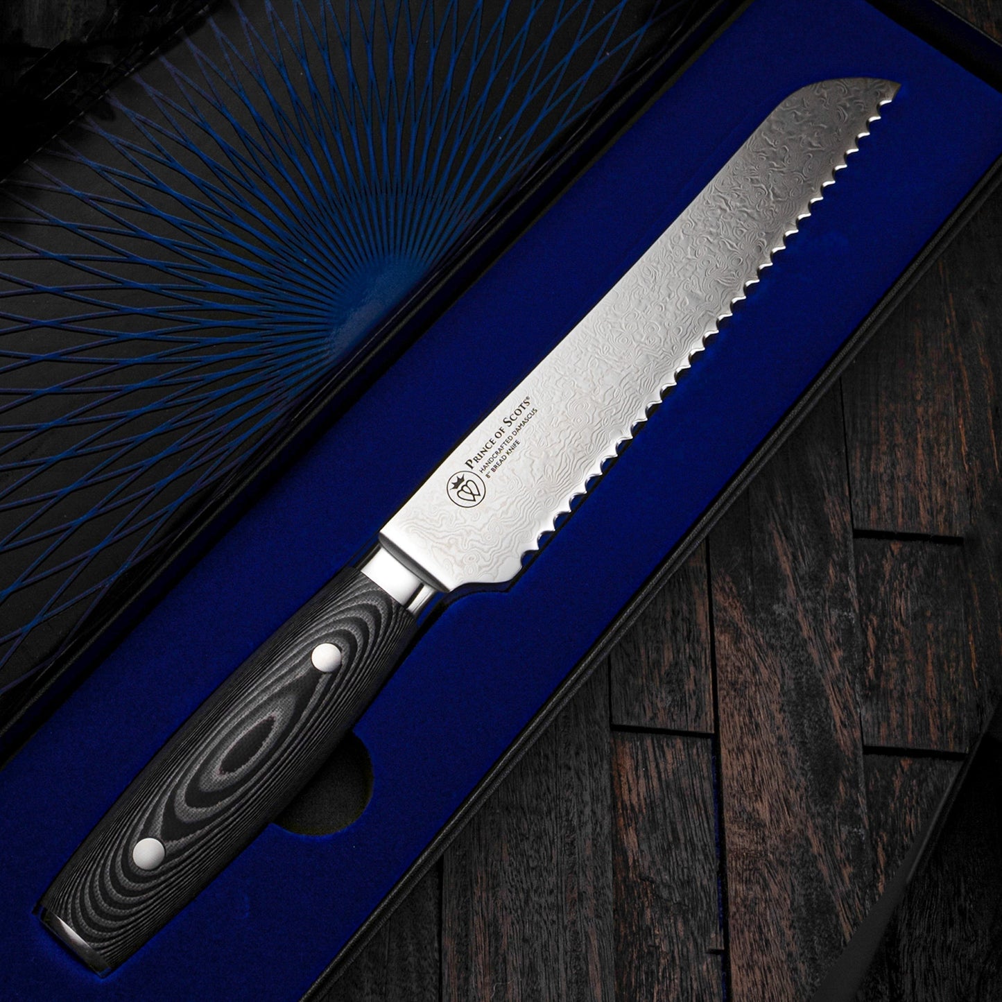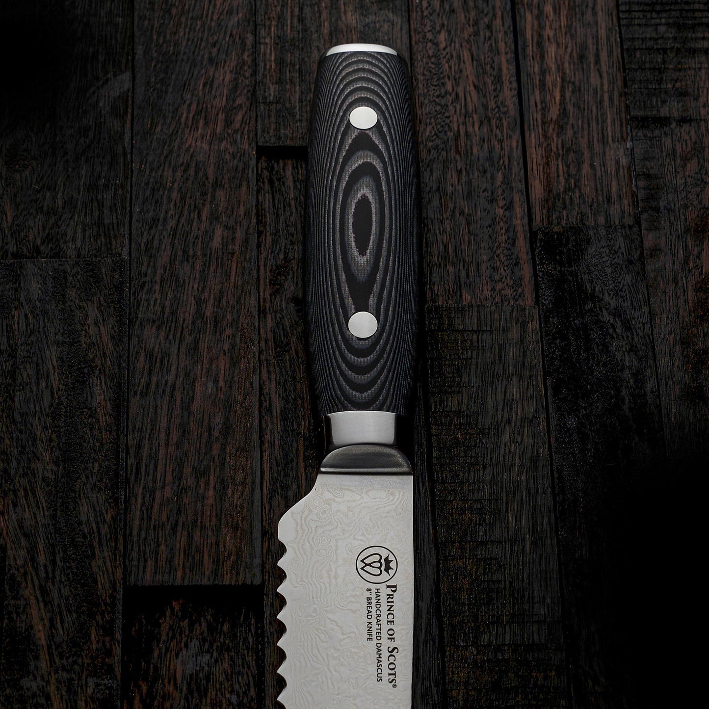 Prince of Scots Damascus knives reflect the craftsmanship of a centuries-old tradition of Japanese knife making merged with American Design and Engineering.  The fusion of Eastern and Western knifemaking philosophies feature increased knuckle clearance for home kitchen use.